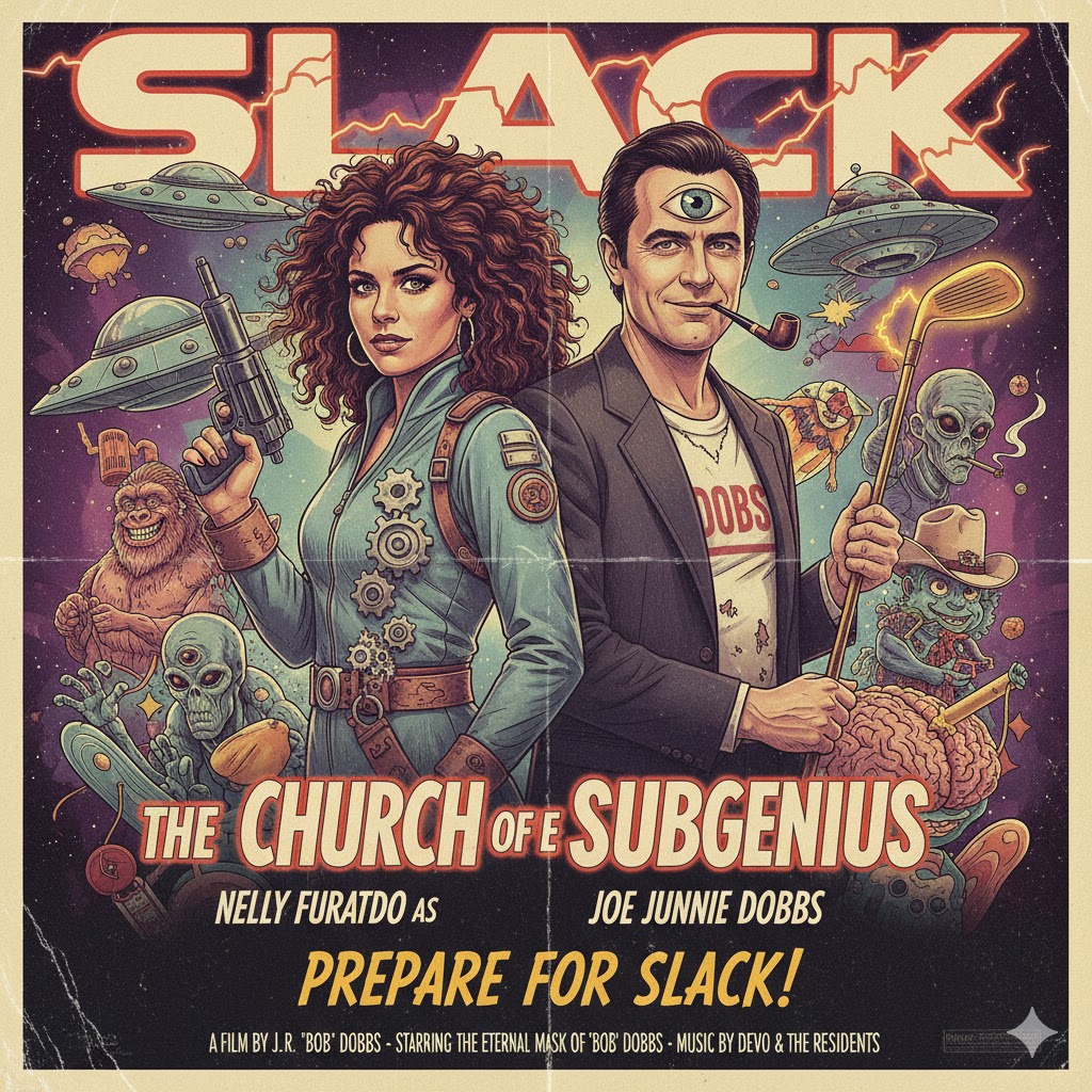 A shimmering neon-pink sky. The fairways look like they were grown on Mars. Over the dunes, a billboard of “BOB DOBBS — THE ROUTE TO SLACK” grins like a Cheshire prophet.