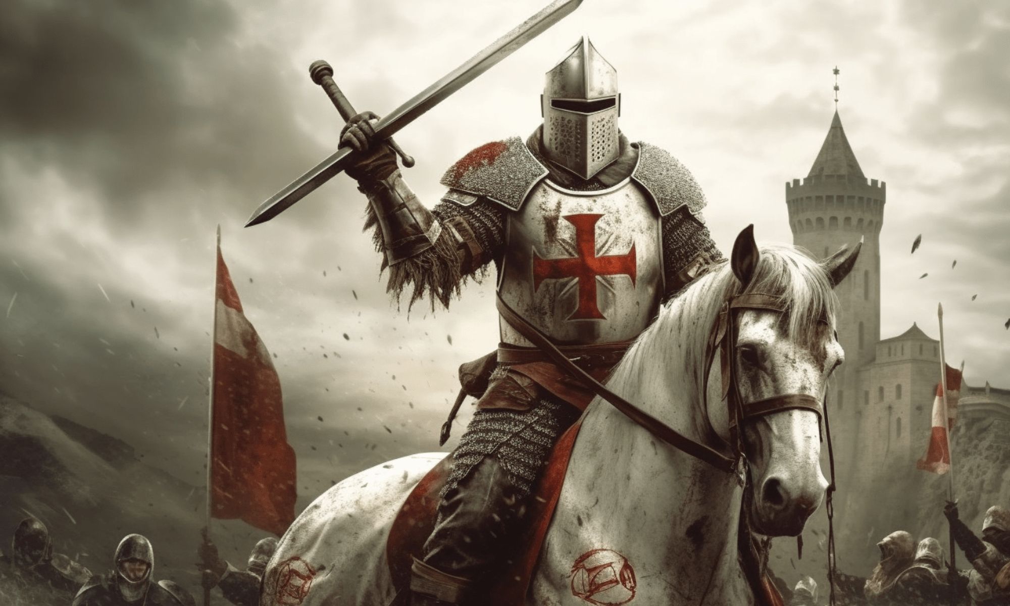 Joe stands in the torch-lit hall of the fortress, the red cross banners of the Knights Templar hanging from the stone walls. Armored knights murmur among themselves, expecting a call to arms.