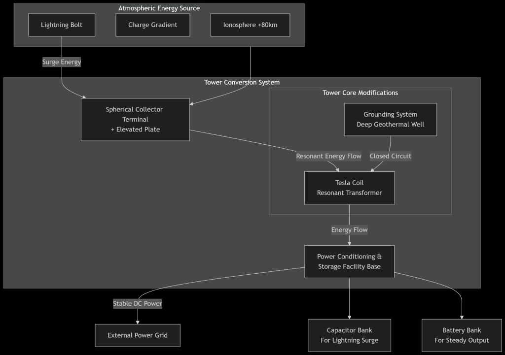 • Energy Transmission: While Tesla envisioned wireless power transmission, for a practical city-grid application, the energy would likely be converted and fed directly into the existing wired grid from the base storage facility.